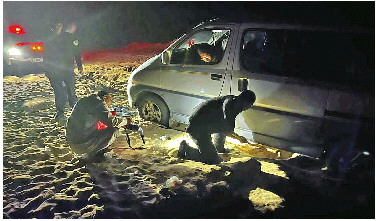 8月6日,茫崖市公安局民警将陷入积沙的被困车辆拉出来。茫崖市公安局供图