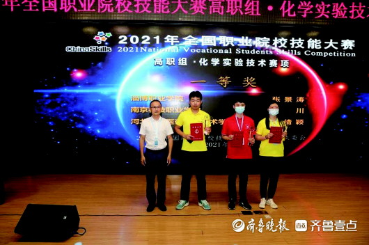 淄博职业学院应用化工技术专业2020级学生张景涛(左二)获2021年全国职业院校技能大赛(高职组)“化学实验技术”赛项一等奖。 (资料片)