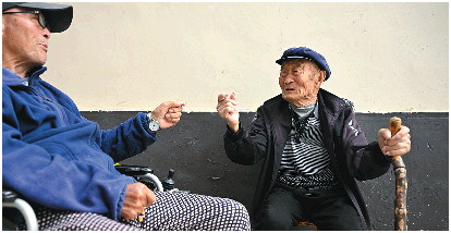 ◤村里人见到在路边坐着晒太阳的马永庆,都会上前和他打个招呼聊聊天。