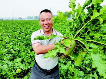 据潍坊绿之园农业合作社理事长于伟忠介绍,近期上市的萝卜品种为翡翠翠玉,较其它品种成熟更早。基地共约2000多亩地,这次上市的萝卜大约200吨,共35万个,13日开始推向市场,精品潍县萝卜市场价10元/个,普通的也能卖到5元/个。虽然比往年提前了一个月,由于管理到位,使用有机肥,这批萝卜口感清脆,爽口甘甜,与往年的品质相仿。