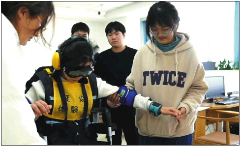◤山东女子学院养老服务管理专业的学生们,课上穿戴设备模拟高龄老人的状态。