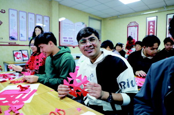 一边讲解一边示范,外国留学生们摩拳擦掌,跃跃欲试。“剪纸太神奇了!真了不起!我喜欢这个‘囍’字,寓意很好。”来自巴基斯坦的乌拉非常喜欢中华传统文化,之前接触过剪纸,但剪‘囍’字还是第一次,觉得难度有些大。但在老师手把手的指导下,最终完成了自己的作品,脸上浮现满满的自豪感。“我要把我的作品收藏起来,带给家人。”
