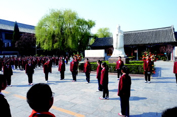 曲阜市实验小学学生在孔子像前诵读《论语》。
