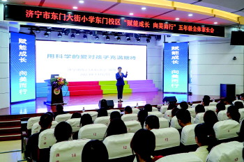 在学术报告厅,济宁市东门大街小学教育集团党总支书记、校长时秋静以“用科学的爱对孩子充满期待”为题作家庭教育培训报告,东门校区执行校长李霞以“赋能成长 向美而行”为主题和家长们坦诚交流学校工作。