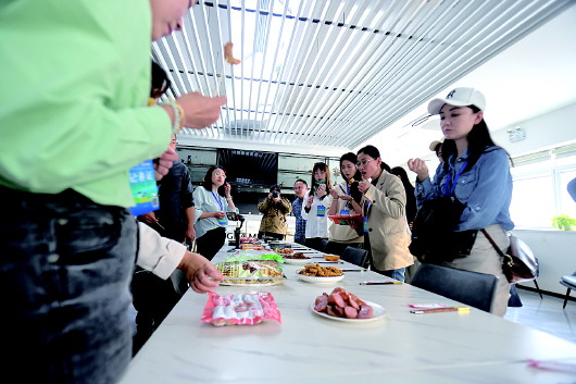 30日,媒体记者们在莱阳市预制菜产业党建综合体,深入了解了莱阳30多家企业的四五百种预制菜产品。