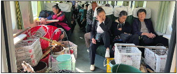 7272次列车不用提前买票,列车员会穿过担子,挤到菜农跟前现场卖票。车票上没有车厢号,也没有座位号,两头挤满了人,中间的位置无人问津。