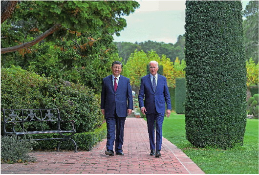 当地时间11月15日,国家主席习近平在美国旧金山斐洛里庄园同美国总统拜登举行中美元首会晤。这是会谈后,拜登邀请习近平一道在斐洛里庄园里散步。 新华社发