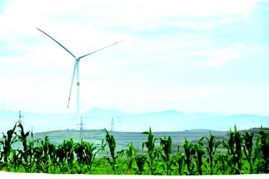 几架“大风车”在天边晴空下悠悠转着,青绿相间的谷黍罩在银白的细网中,沉甸甸的穗子翻滚成浪。
