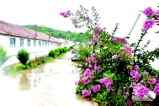 村里宽敞的道路、鲜艳的花朵在雨后显得格外明目。