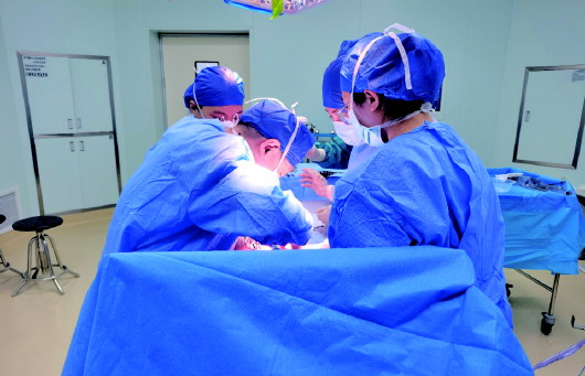 图为张友忠教授(左)为患者进行手术。