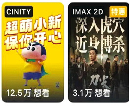 电影《无价之宝》海报的宣传卖点是“比惨没输过,做人赢一回”,能看出和“小人物的奋斗逆袭”有关,爱情电影《靠近我一点》的海报也是“八字组合”——“冬日恋爱,约会首选”,动画电影《蜡笔小新:新次元!超能力大决战》的海报视觉以轻松为主——“超萌小新,保你开心”。这些被大字占据整个版面的电影海报,非常具有视觉冲击力。