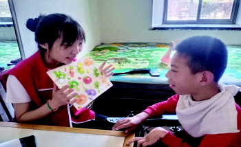 例如张涵爽和张涵雪,这是一对双胞胎姐妹,母亲生产时产中缺氧,导致两人均成为脑瘫儿童。通过对两人全面细致地评估,分别制定了个别化教育计划。妹妹涵爽残疾程度非常严重,无法行走,生活完全不能自理,只能卧床,长期借助轮椅生活,在运动、认知等方面均受到不同程度的影响,因此对妹妹涵爽,制定了侧重送康复的方案,教师们用丰富的教学手段,利用多种教具,对涵爽的语言表达、感知训练、粗大动作运动、精细动作运动等方面进行了训练和干预。姐姐涵雪残疾程度较妹妹稍好,除了独立行走不便,认知与沟通跟普通孩子差异不大,现就读于本村小学。于是制定了融合送教的方案,普校教师主要负责姐姐涵雪在校的正常授课及语言训练与沟通交流,而教师一周一到访,负责给涵雪查漏补缺及心理干预。