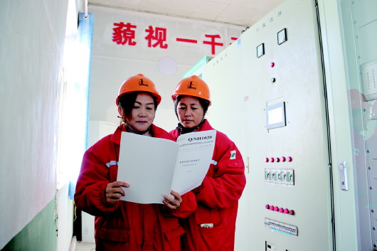 职工参照新修订的标准手册对测控柜电压、电流数据进行检查。 通讯员 蔡明战 摄