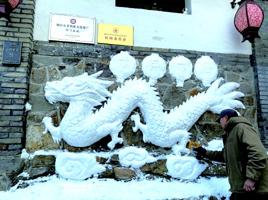 12月16日下午,在烟台所城里,一条爬在墙上的“飞龙雪雕”不断吸引游人打卡围观。软陶艺人李仁敬说,雪后应女儿要求,他在墙上用雪堆出一条巨龙。(受访者供图)