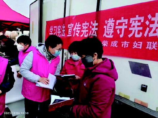 荣成市妇联组织工作人员走进乡村大集发放宣传资料、开展法律咨询等,大力宣传宪法、民法典等与群众生活息息相关的法律法规。荣成市综合行政执法局执法人员到俚岛镇大集开展普法宣传活动,并发动沿街商户充分运用门前LED屏等各类传播媒介发布宪法宣传教育内容,培育广大群众的宪法意识。