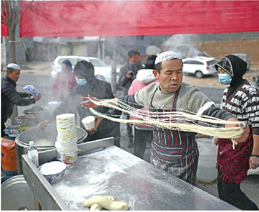 35岁的马俊海家住青海省海东市民和回族土族自治县官亭镇,地震中,他家经营的拉面馆受损。20日一早,马俊海和家人购买了20袋面粉,在受损店铺前支起锅灶,免费做拉面,一碗又一碗热气腾腾的拉面送到了乡亲们手中,驱走冬日的严寒。图为居住在附近的马国龙(右二)在马俊海的拉面摊上帮忙拉面。 新华社发