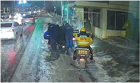 “我们下去给他扶起来吧。”见状,宋振先立即停车,向车内乘客解释后,便解开安全带准备下车。车上的乘客闻声也纷纷起身,冒雪冲下了车,投入救援之中。宋振先与7名乘客一起赶了过去,帮忙把电动车和外卖小哥扶起,并安置到路边安全地带,宋振先和乘客在确认小哥没有受伤后,便和乘客们重新回到车上,离开了现场。