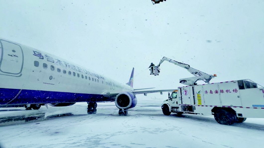 冰雪中的济南机场在进行安全保障工作,改扩建之后飞行区等级将升至4F最高等级。