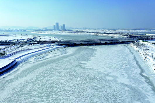 12月25日下午,在威海市双岛湾大桥附近,受寒潮强冷空气影响,附近海域沿岸水面结冰。威海市国际海浴场和孙家疃等地的海岸护栏也被厚厚的冰层包裹,大风卷起海浪扑打上岸,海水在冰点以下的气温中凝结,在护栏上形成“冰挂”蔓延数十米,吸引众多市民打卡拍照。