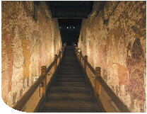 考虑到壁画非常脆弱,展示的时候是不可能让观众进到里面看的。所以展陈人员设想把整个壁画墓抬高,壁画墓吊装时重3.5吨,把里面的材料去除后不足3吨,然后把整个壁画墓抬高3米,这样观众仰视就可以看得很清楚、很全面了。
