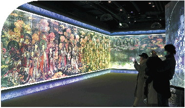 在法海寺壁画艺术馆,一幕幕4K高清显示屏详细展示了法海寺壁画的具体内容,展示的人物、画面尺寸均1比1还原真迹,还能动态高清展示局部细节,配套详细语音讲解。如“水月观音”像,高清屏幕可以将壁画的细节放大到极致,清晰地展示每一笔技法,特别是观音身上的白色披纱。