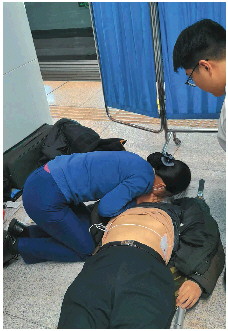 “准备电击,所有人散开。”魏市民张开双手,紧紧盯着AED设备。“电击成功,请进行心肺复苏。”提示音响起,刘文亮和魏市民跪在地上轮流开展胸外按压及人工呼吸。