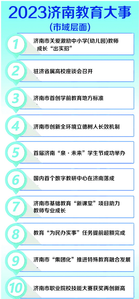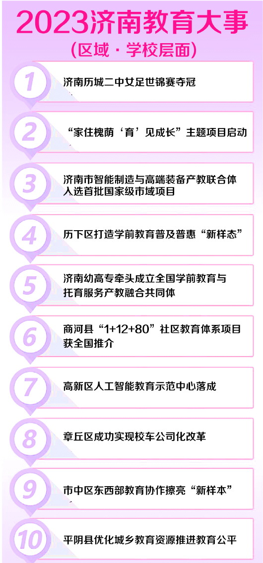 评选活动受到社会各界广泛关注,共收到公众投票100余万票,综合社会各界投票与“2023年度济南教育大事”评委会评审意见,最终评定产生“年度教育大事”各10件。