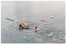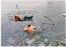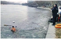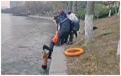 “救命!救命!”白浪河中突然传来急促的声音。此时,一名环卫工人沉浮于白浪河水面,一边扑打水面,一边大声呼喊。正在附近冬泳的王建民听到求救声后,拿上游泳圈就往落水处跑。