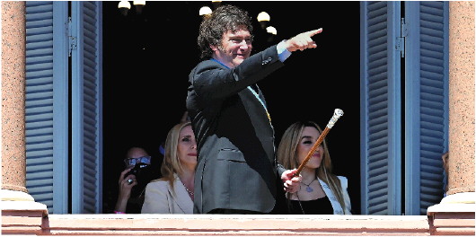 这是2023年12月10日米莱就职后在总统府玫瑰宫阳台上向民众致意的照片。 新华社发