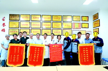 2022年8月16日,胸痛中心成功救治一名无家属陪护的心梗患者,患者康复出院当天,公司领导同事给医护人员送来锦旗