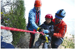 天涯(左一)和队员正在对孩子进行绳索运动的训练。