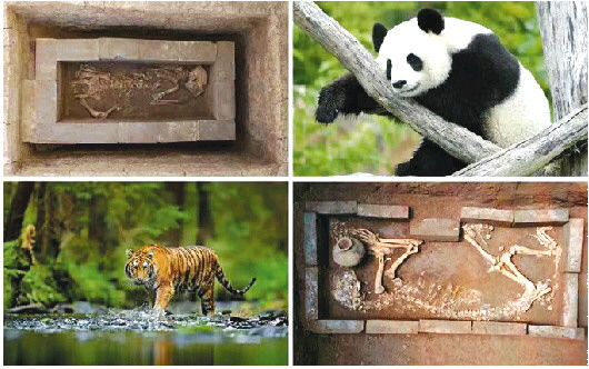 霸陵动物园殉葬坑出土的大熊猫骨骼(左上)、老虎骨骼(右下)与大熊猫、老虎实景对比。供图/陕西省考古研究院
