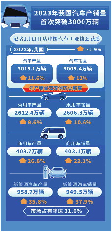 1月11日,中国汽车工业协会公布的数据显示,2023年我国汽车产销分别累计完成3016.1万辆和3009.4万辆,汽车产销量创出新高。自此我国汽车产销总量连续15年稳居全球第一。