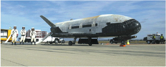 X-37B又称轨道试验飞行器,由美国波音公司制造,长约9米,翼展约4.6米,外形类似航天飞机,但体积只有航天飞机的四分之一,部分供电来自太阳能,据称飞行速度可达25倍音速以上。这种飞行器配备自动着陆系统,由火箭送入太空,返回时像飞机那样在跑道上滑行降落,可重复使用,但不载人。美国国家航空航天局1999年启动了X-37B项目,2004年移交美国军方,包括成本在内的所有细节均处于保密状态。