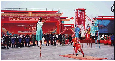 锣鼓齐鸣,唢呐吹奏,舞龙、舞狮、旱船、花轿、高跷等民俗文艺表演纷纷登场。身穿民俗服装的千人秧歌队是一大亮点,他们由文化志愿者、职业学校学生组成,以秧歌队舞蹈展示和队形变化,展现山东人的厚道质朴和热情好客。