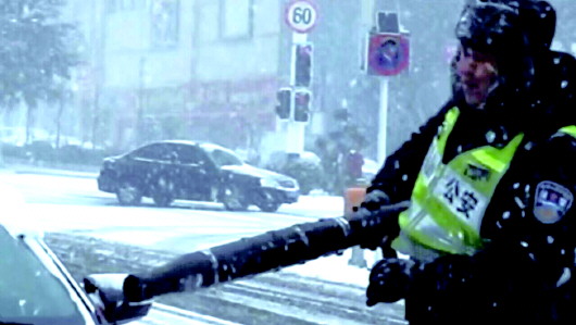 暖心交警用鼓风机 为群众清理车辆积雪