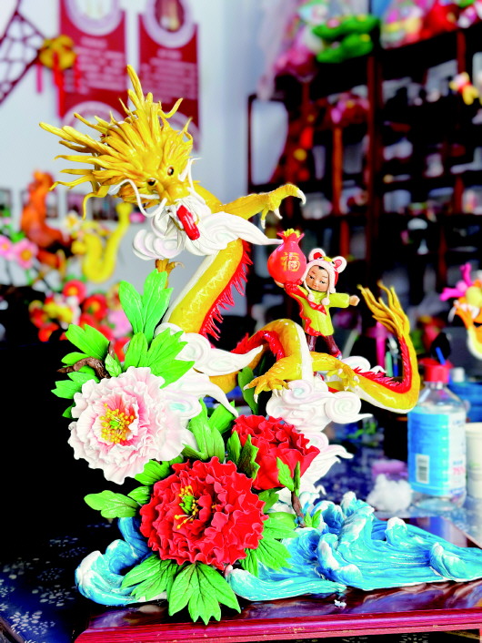 ◤ 图为枣庄市鲁南花馍非遗传承人王欣制作的枣庄鲁南花馍面塑作品《祥龙献瑞》。 (记者 王函 摄)