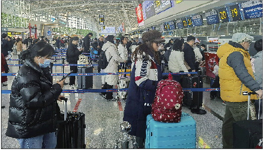 在山航主任值机柜台,工作人员正在为部分晚到的旅客办理值机。山航工作人员告诉记者,为确保旅客安全顺畅出行,山航加强生产组织保障。针对冬季运行复杂恶劣天气、新开/复航航线、国际航班保障等重点环节,山航要求各保障单位严格落实应急值守联动机制,加强值班力量配置,着力提升应对复杂天气、航班延误及其他突发情况风险处置应对能力。