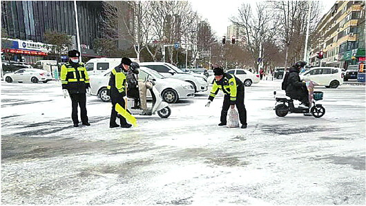 受西南暖湿气流和较强冷空气共同影响,1月31日16时至2月1日10时,济南南部、泰安、枣庄、临沂等多地出现中到大雪,全省平均降水量2.1毫米。我国中东部大范围雨雪冰冻天气仍将持续。2月1日10时,中央气象台首次发布冰冻橙色预警,这是自2010年设立冰冻预警标准以来,发布的最高级别冰冻预警。预计3日夜间—5日白天,山东自西向东仍有一次大范围降雪降温过程。图为1月31日晚降雪如期而至,临沂相关部门迅速启动应急预案,及时除雪融冰。 本报记者 摄影报道