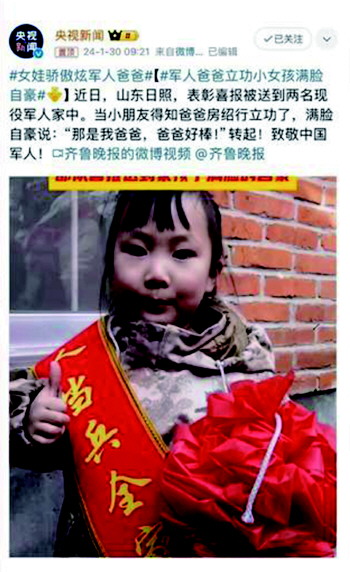 “我爸爸好棒!”当部队喜报送到家时,小女孩脸上写满了自豪。1月27日,日照市东港区陈疃镇石旺沟村,齐鲁晚报·齐鲁壹点记者跟随工作人员送达表彰喜报时,抓拍到了这一感人瞬间,并以《果然视频丨“我爸爸好棒!”当部队喜报送到家,女孩脸上写满自豪》进行全网首发。首发后,央视新闻、人民日报数字传播、环球时报、法治日报等媒体纷纷转发,引全网关注。