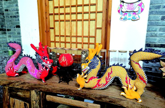 顺着朱武学手指的方向,记者看到几个造型逼真、颜色亮丽的龙布偶正一字形站成行,高昂的龙头栩栩如生。这样精致的龙布偶以传统中国龙典型的艺术造型和纹样元素为基础,以棉布为面料、珍珠棉为填充物,采用刻板刮印、缝合填充等工艺,进行创意设计生产。