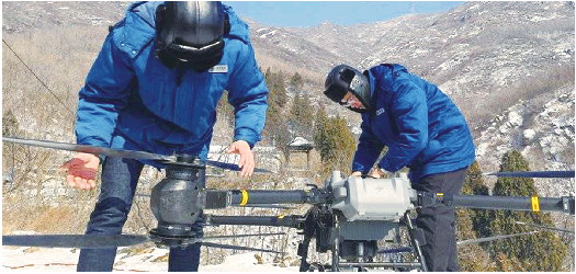 巡线队员们在大山上操作无人机,准备为高铁电力线路除覆冰。