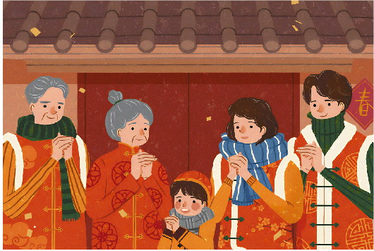 拜年。拜年是春节期间家人及亲朋好友互相道贺、祝福的习俗,它由来已久,至今不衰。拜年时,首先进行家拜,一家人中,晚辈给长辈拜年,平辈之间年少者给年长者拜年。然后进行近拜,就是给没出五服的长辈拜年。最后是远拜,给出了五服的长辈和邻里年长者拜年。