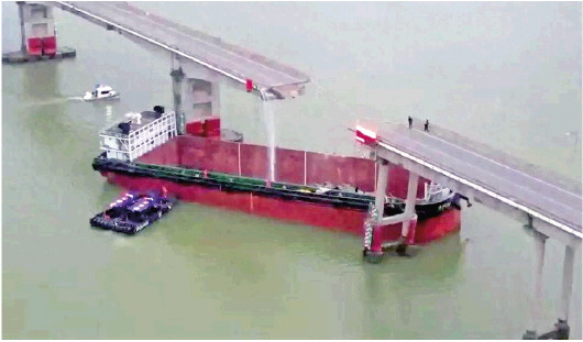 2月22日凌晨,佛山籍集装箱船“良辉688”轮在航经南沙洪奇沥水道时,因船员操作失当,“良辉688”轮左舷船身触碰沥心沙大桥下行通航孔18#桥墩,随后船头再次触碰下行通航孔19#桥墩,致使该通航孔上的桥面断裂。经核实,共有4辆车和1辆电动摩托车从断裂处坠落,其中1辆空载中巴车、1辆货车和1辆电动摩托车坠落到“良辉688”船舱内,2辆小货车掉落水中。事故造成5人死亡(空载中巴车驾驶员1人、电动摩托车驾驶员1人、落水小货车3人),2人在医院救治,目前生命体征稳定;肇事船舶一名船员轻微伤。