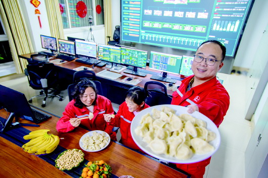 农历除夕,胜利油田孤岛采油厂注聚技术服务中心值班员工陶丽芳、杨琴霞在生产指挥中心,吃着同事马玉巍在家包好煮好,由经理于世强送来的饺子,共话丰年。