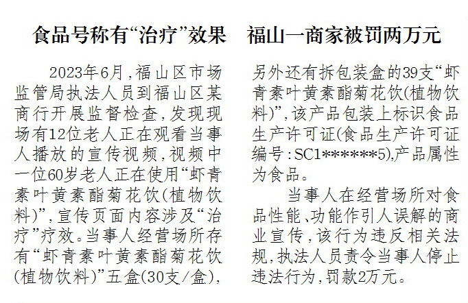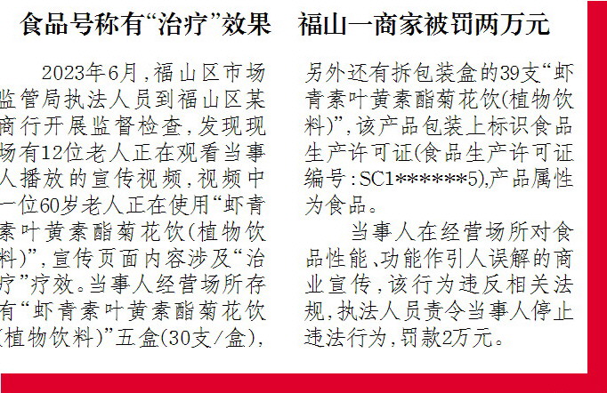食品号称有“治疗”效果 福山一商家被罚两万元
