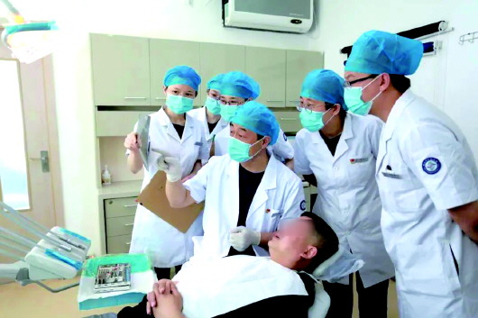 烟台市口腔医院党委书记、院长柳忠豪(右三)与团队人员正在为患者做口腔治疗。