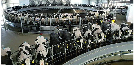 ◤2月27日,在山东省临沂市沂南县蒲汪镇一家企业牧场,工作人员在转盘式挤奶机旁工作(无人机照片)。 新华社发