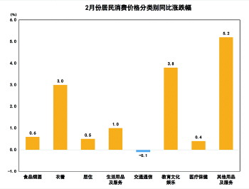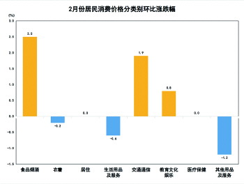 八大类环比“三涨二平三降”。2月,食品烟酒价格环比上涨2.5%,影响CPI上涨约0.66个百分点;其他七大类中,交通通信、教育文化娱乐价格环比分别上涨1.9%、0.8%;居住、医疗保健价格环比持平;衣着、生活用品及服务、其他用品及服务价格环比分别下降0.2%、0.6%、1.2%。