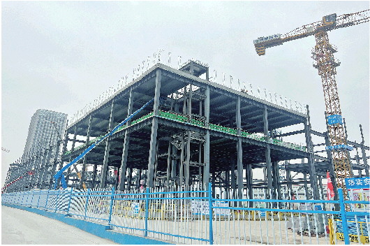 济钢防务卫星总装基地一期厂房已封顶,预计今年下半年投产。 记者 李梦瑶 摄